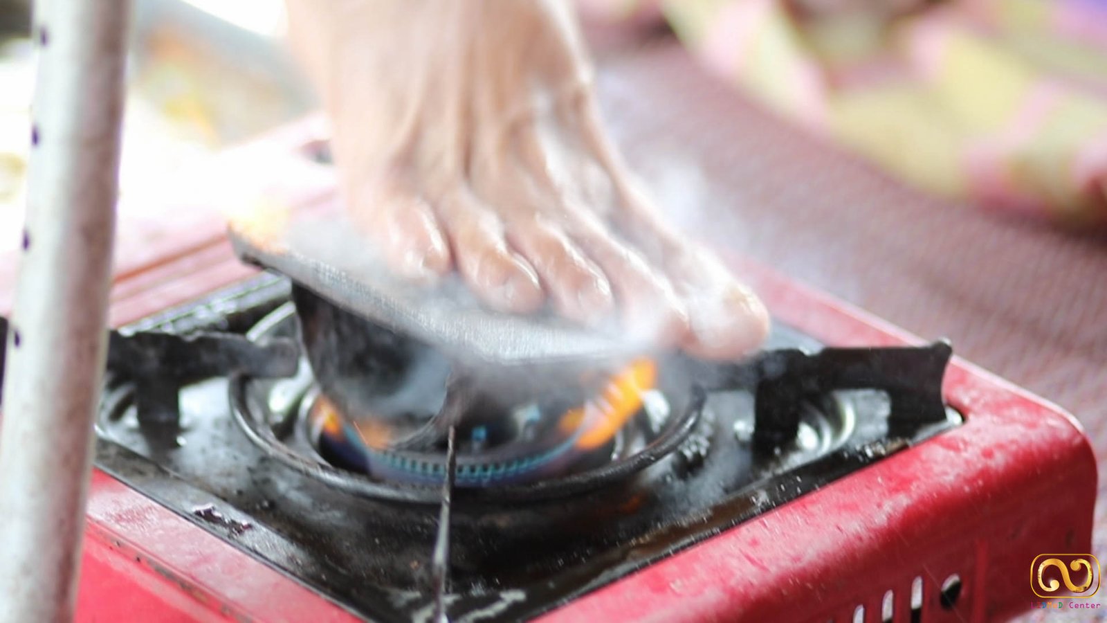 เป่าคาถาลงไปในน้ำมนต์ “อมกาลุ มหาทลาย ตีนซ้ายย่ำพระอาทิตย์ ตีนขวาย่ำพระจันทร์ หลังจากนั้นหมอจะเริ่มจากการเหยียบลงน้ำมันไพล และน้ำมันงา สลับการตามส่วนต่างๆของร่างกาย เช่น สะบักหลัง แขน ก้นกบ และขาทั้ง 2 ข้าง เป็นต้น