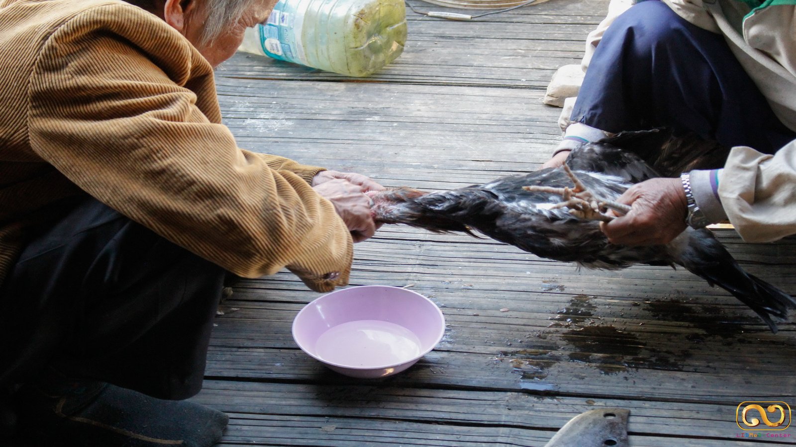 3. เชือดคอไก่ เพื่อนำเลือดของไปต้มพร้อมกับน้ำต้ม