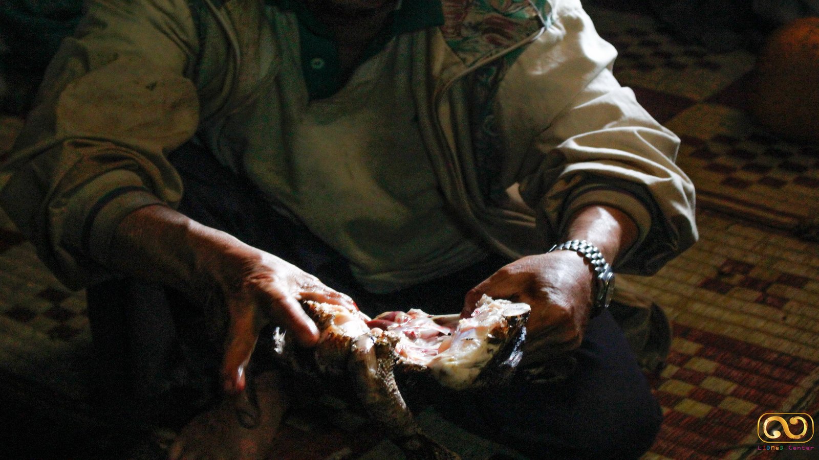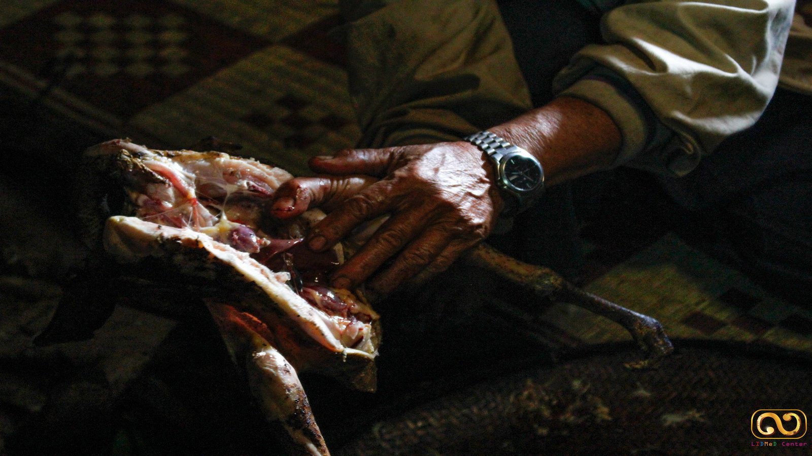5. ผ่าท้องไก่เพื่อดูดีไก่ (ดีไก่เป็นตัวบอกว่าไก่ตัวนี้ควรนำมาประกอบพิธี) ถ้าดีไก่ดี สมบูรณ์จะสามารถนำมาประกอบพิธีกรรมขั้นต่อไปไปได้
